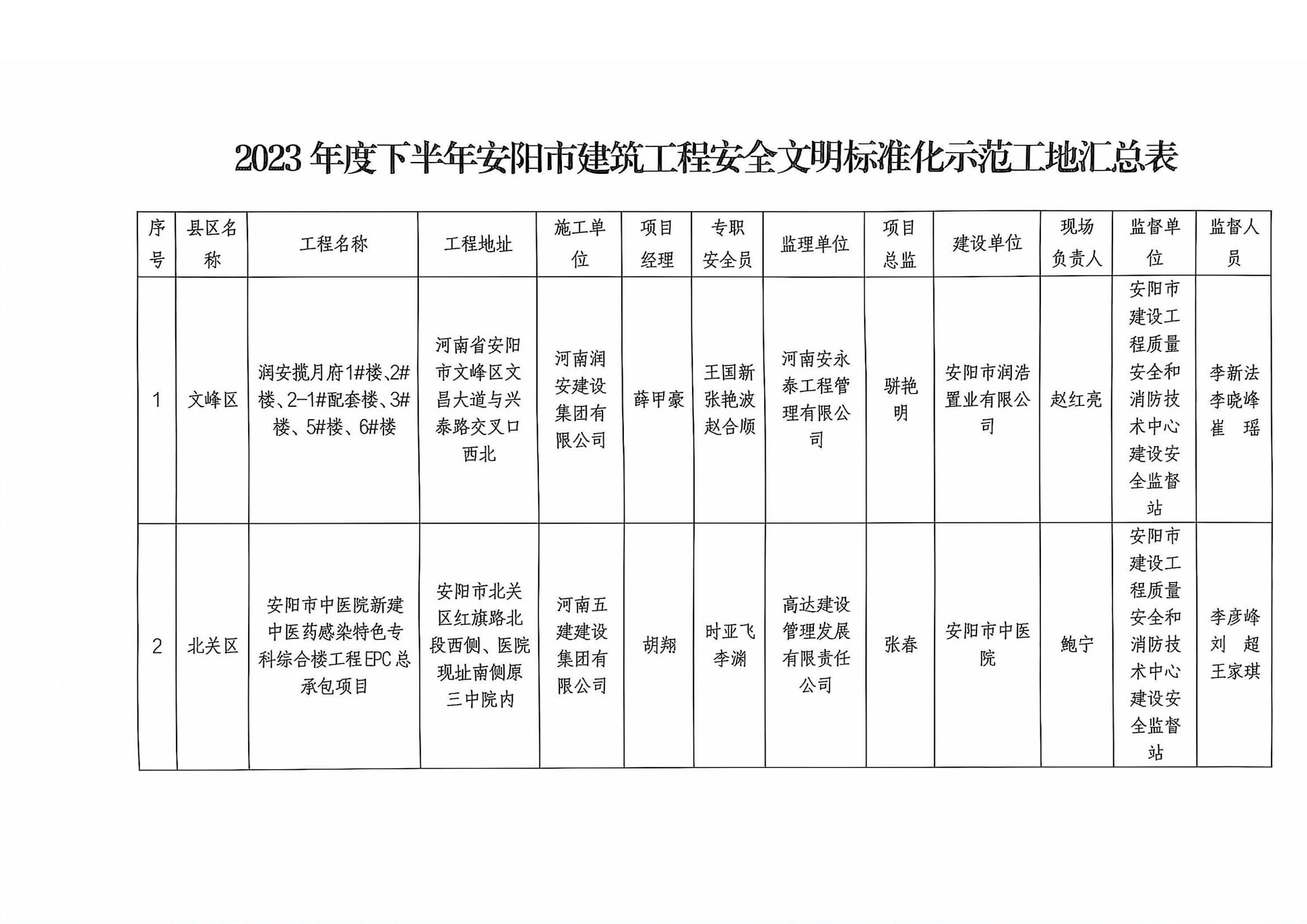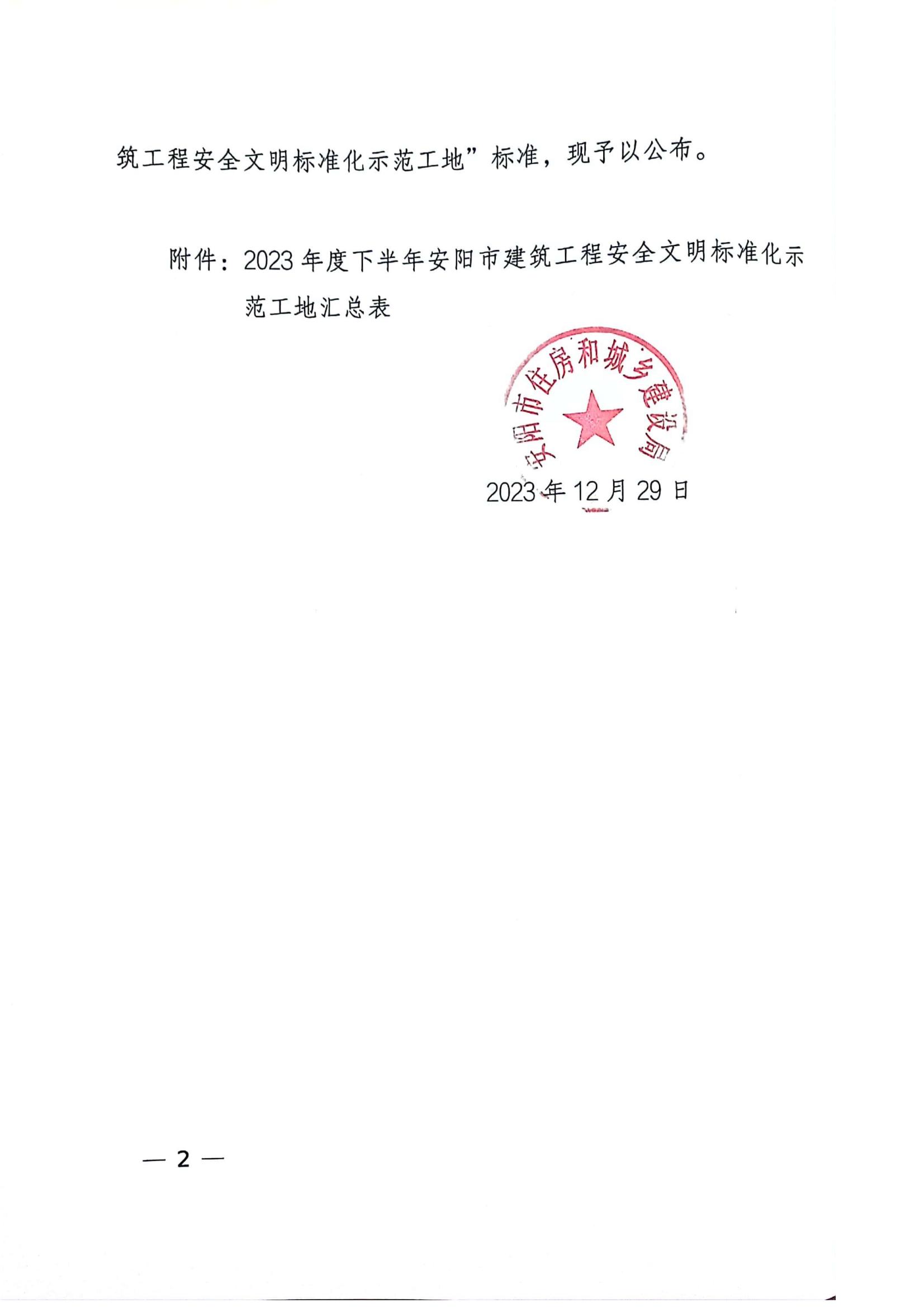 安阳市住房和城乡建设局关于公布2023年度下半年安阳市建筑工程安全文明标准化示范工地的通知